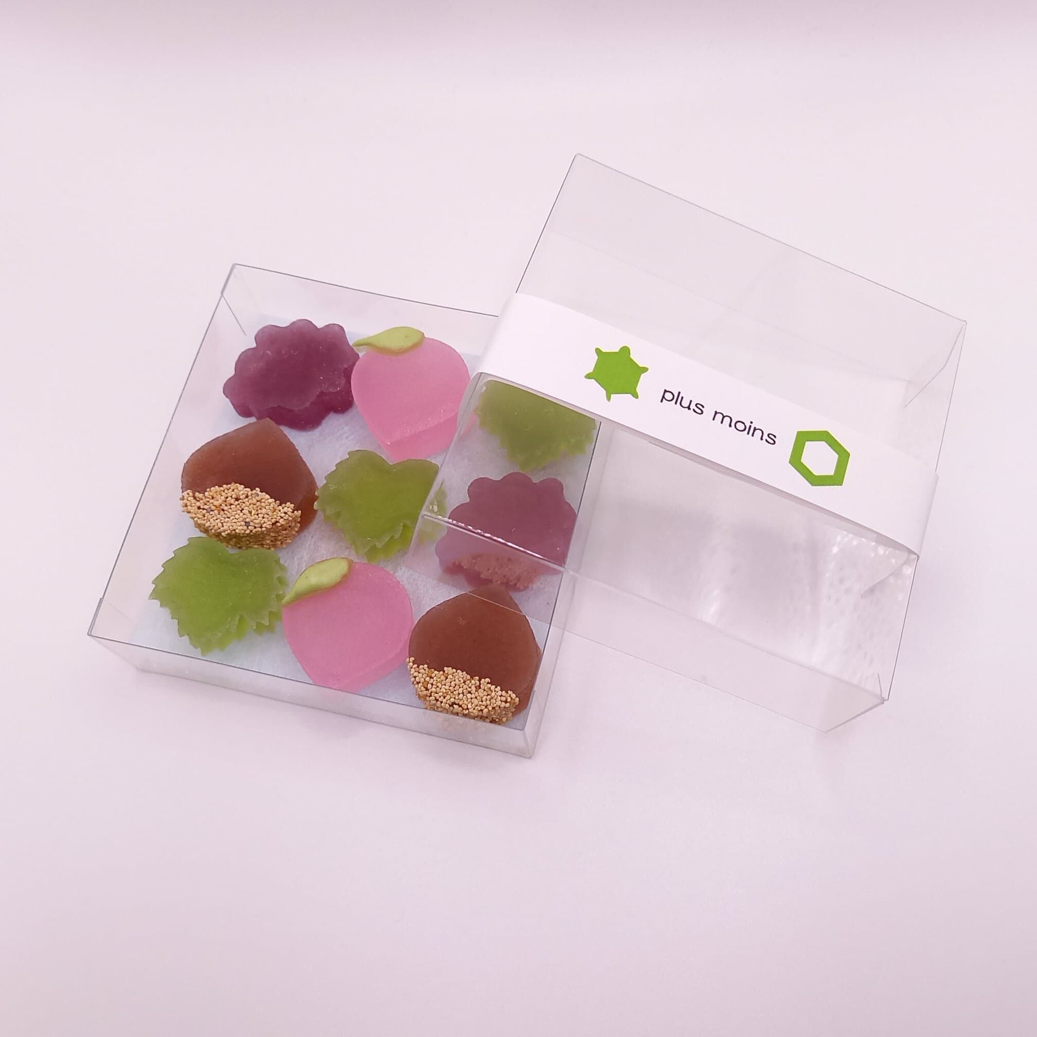 寒天、砂糖、天然色素、卵白、白桃、ブドウ果汁、マロンパウダー、ケシの実