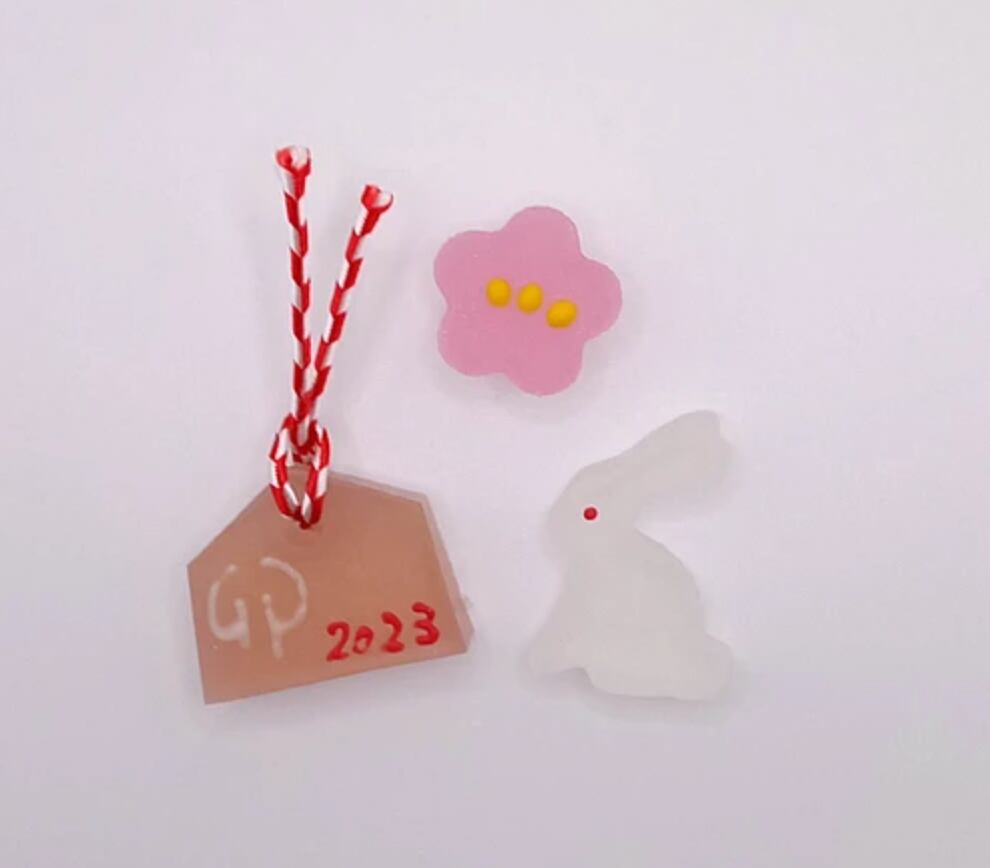 兎と絵馬と梅のおめでたい3点の琥珀糖。
